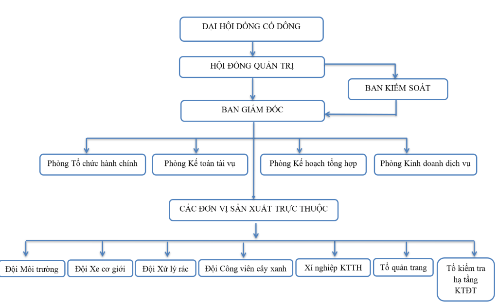 – Các đơn vị sản xuất trực thuộc: Đội Môi trường; Đội Công viên cây xanh; Đội Xe cơ giới; Đội QLHTKT đô thị; Đội Xử lý rác; Xí nghiệp KTTH; Tổ quản trang; Tổ kiểm tra hạ tầng KTĐT