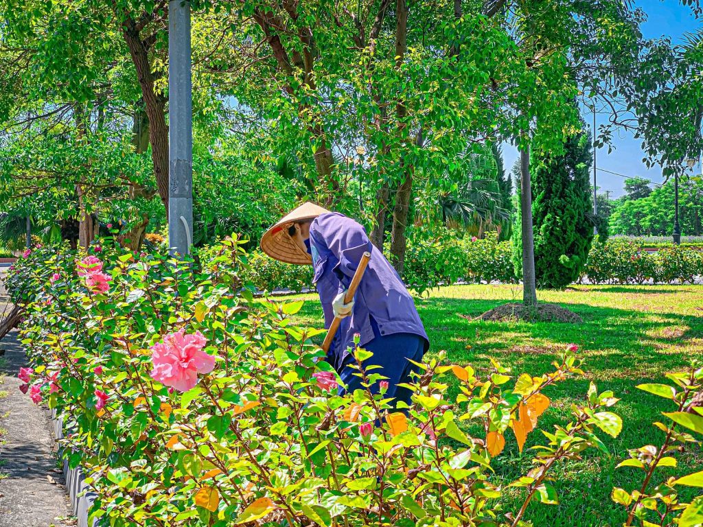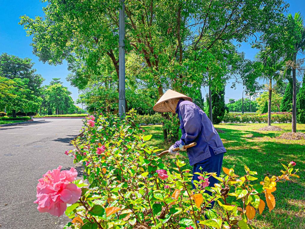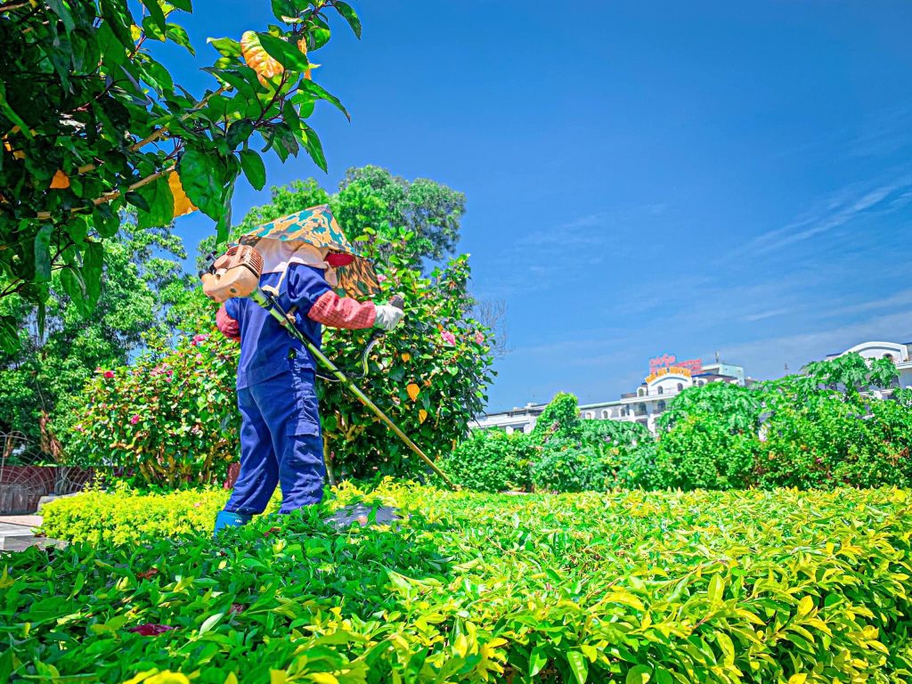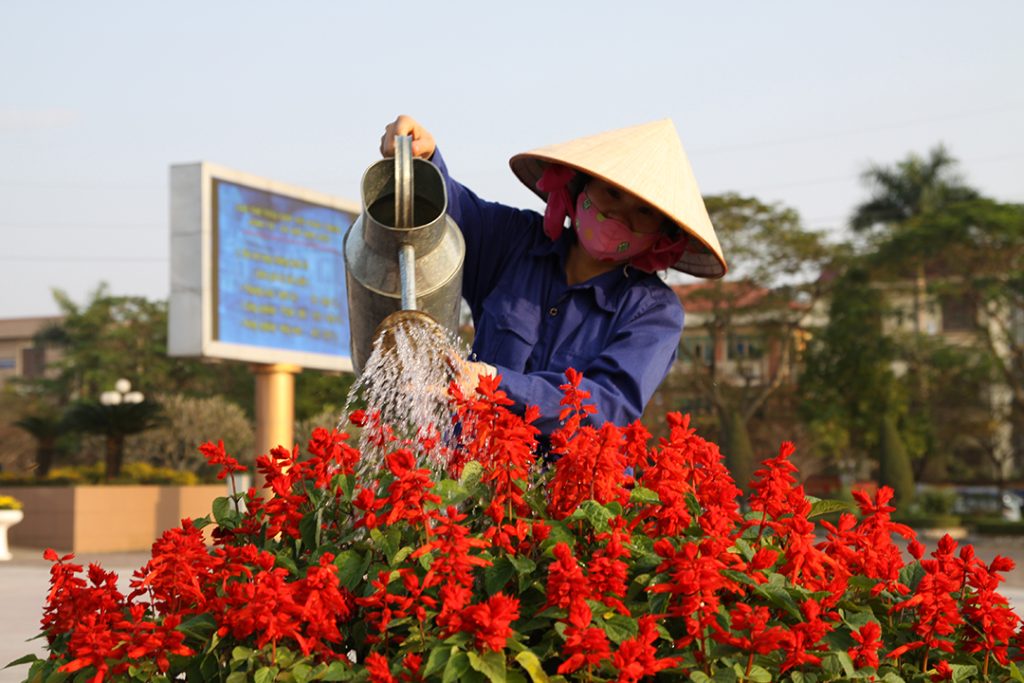 Thực hiện công tác duy trì, chăm sóc, tưới nước, cắt tỉa cây hoa, thảm cỏ, cây cảnh, quét vôi gốc cây… theo Kế hoạch DVCI;
